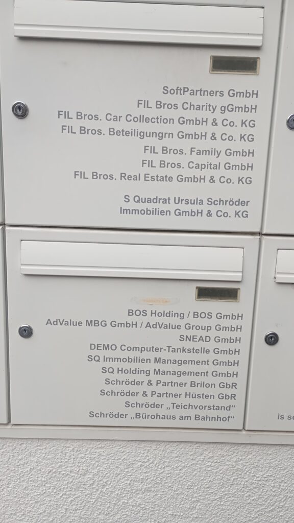 - S Quadrat Ursula Schröder Immobilien GmbH & Co KG, 40 Objekte mit über 300 Wohneinheiten und 45.000 qm Gewerbefläche hauptsächlich in Brilon und Altenburg. Beteiligung von 80% durch Tom Schröder privat.